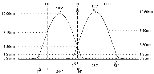 distance between valve and piston 1.0mm (pref. 1.5mm). check 5-15° before TDC on exhaust, and after TDC on intake